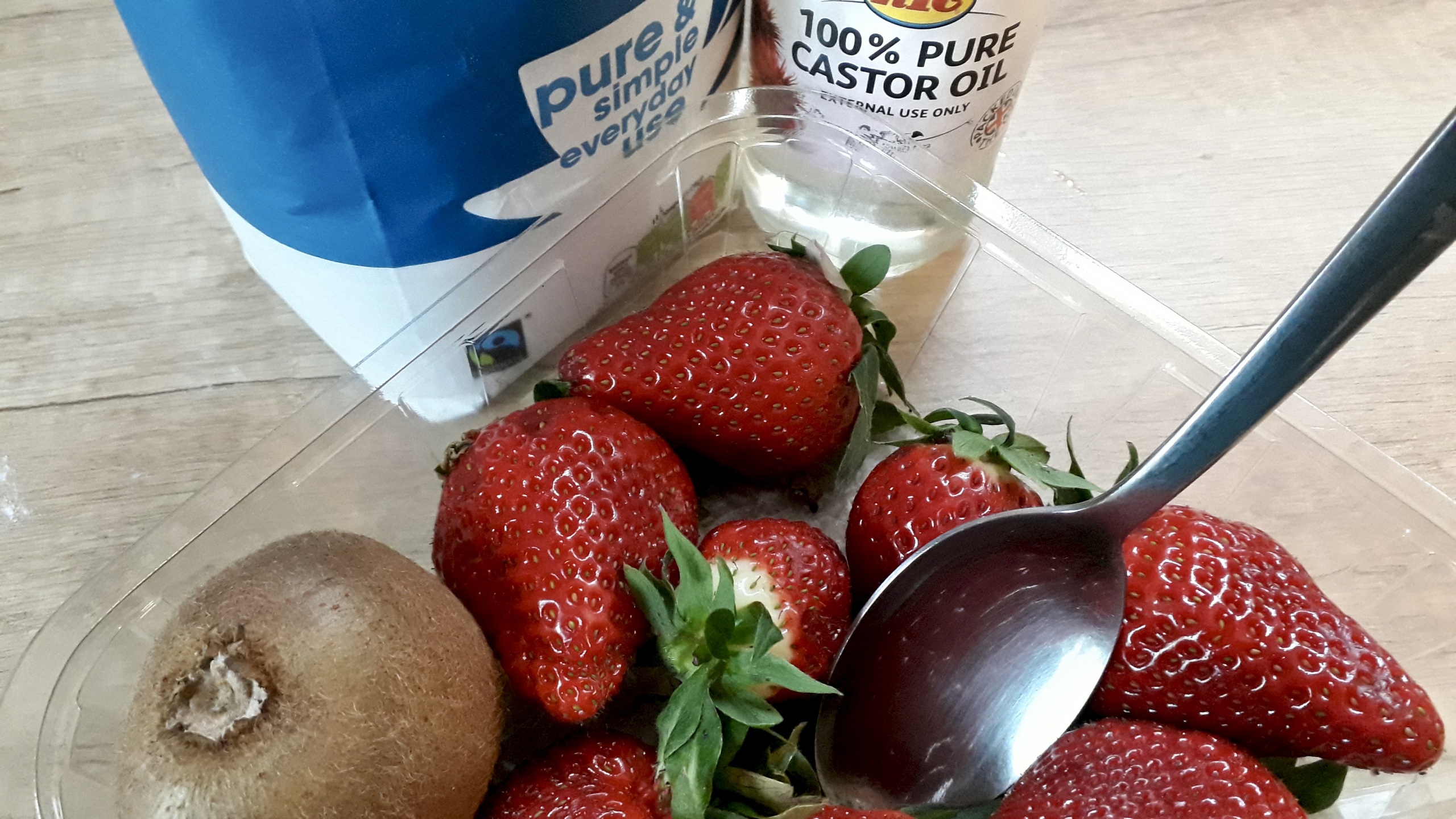 So the first lip treatment I tried was an exfoliating collagen lip mask to help stop the aging process. Apparently old lips are not appropriate on old people. The mask contained strawberry and kiwi, which are apparently collagen stimulating fruits. According to The Complete New Herbal, strawberries are also rather good with teeth, removing plaque and whitening them. But given the shedload of sugar that also goes into this concoction, I thought it best not to repurpose the slop afterwards. And then the last ingredient was a vitamin E capsule, which I didn’t have, so I subbed in castor oil, which is said to be very good for thickening eyebrows.